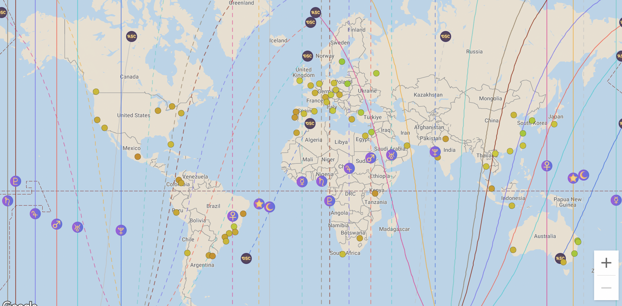 Forza Planetaria nel Tema Natale: Se un pianeta è particolarmente forte nel tuo tema di nascita (attraverso dignità, aspetti o posizione di casa), la sua influenza astrocartografica può estendersi più lontano e sentirsi più intensa.